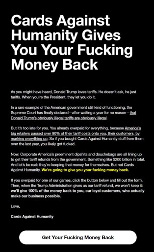 UnderpantsWeevil@lemmy.world to Not The Onion@lemmy.worldEnglish · 6 days agoCAH Gives You Your Fucking Money Backlemmy.worldimagemessage-square67linkfedilinkarrow-up1198arrow-down12