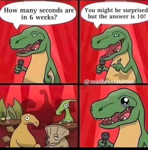 minus-squarewewbull@feddit.uklinkfedilinkEnglisharrow-up3·20 hours ago6 Weeks * 7 days * 8 * 3 (24) hours * 2 * 4 * 5 * 9 * 10 (3600 = 60²) seconds The last one is a bit of a jump, but 9 * 4 is 36 and 10 * 5 * 2 is 100 so together it’s 3600.