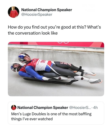minus-squaregigastasio@sh.itjust.workslinkfedilinkarrow-up1·11 days agoCraig: “What are we doing again?” Mark: “We need to practice our luge doubles.” Craig: “…” Mark: “So I’m gonna need you to lie down on top of me.” Craig: “Mark, this is a couch.” Mark: “It’s just practice. We don’t have to be moving.” Craig: “Mark, you asked me over to watch football.” Mark (turns on football game): “Now come over here.”