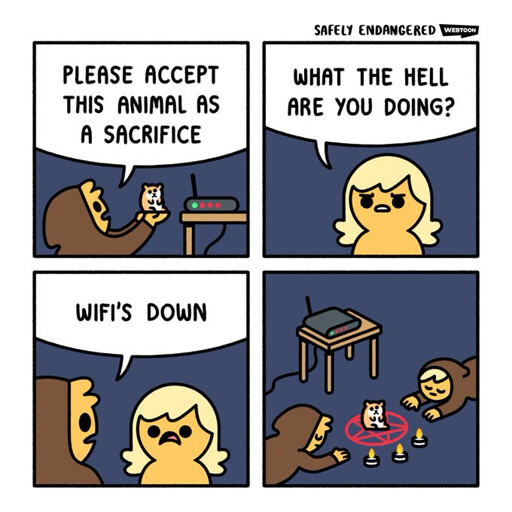 arrow-up1848arrow-down1imageThe Wifi God Demands itlemmy.worldekZepp@lemmy.world to Comic Strips@lemmy.worldEnglish · edit-24 days agomessage-square60linkfedilinkfile-text