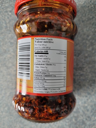 I can’t load the picture, may anyone can give me the whole nutritional facts on that chili oil jar?
