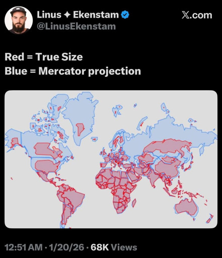 I’ll add that we use the mercator projection because it preserves shapes but not scale. There’s other projections that preserve scale but not shapes.