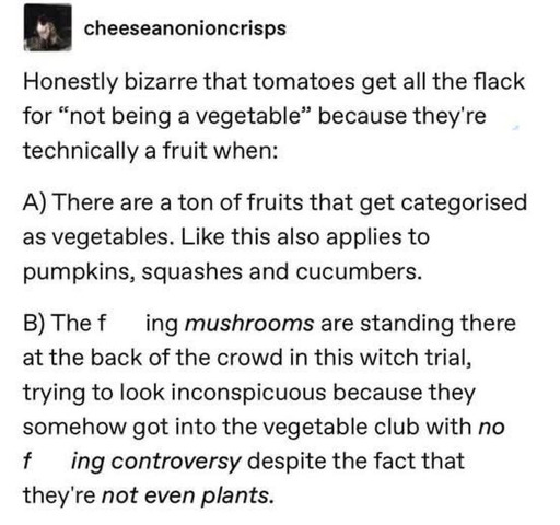 minus-squaremoobythegoldensock@infosec.publinkfedilinkEnglisharrow-up0·5 months agoWhat? Who’s calling pumpkins, squashes, and cucumbers vegetables? And no one calls mushrooms vegetables: mushrooms are mushrooms.