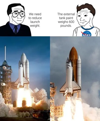 600 pounds of white paint for the fuel tank was considered unnecessary, once the engineering team figured that it didn’t actually protect the special foam covering of the fuel tank anyway. Thus the distinctive orange color!