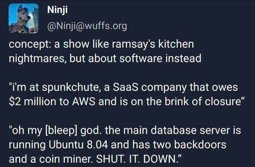cm0002@lemmy.world to Programmer Humor@programming.dev · 8 months agoRamsay's kitchen nightmares, but for software developmentlemmy.mlimagemessage-square3linkfedilinkarrow-up11arrow-down10
